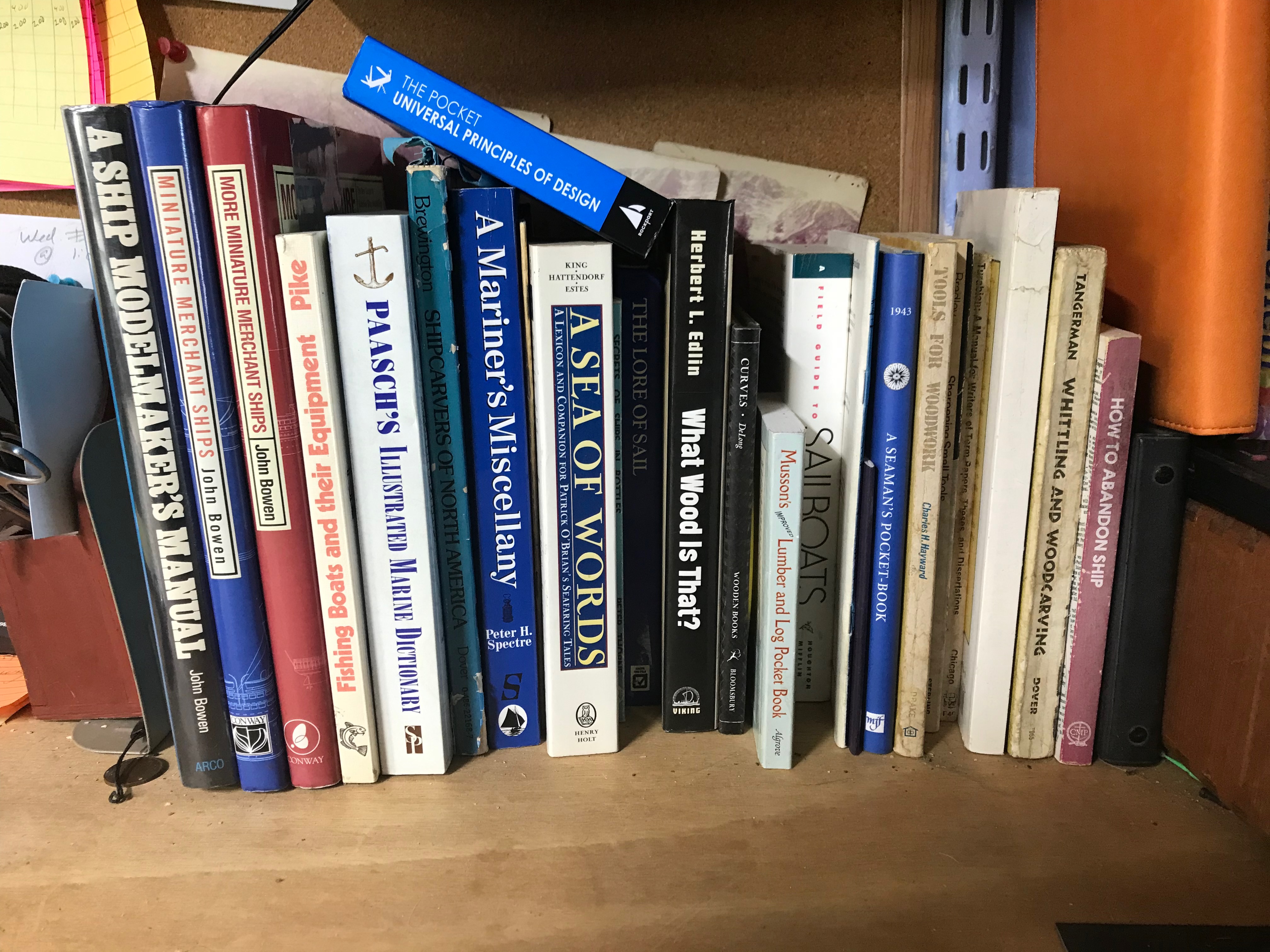 Research for a carved ship portrait involves digging into the library and pulling out what looks applicable. So for a picture of a fishing schooner, I’ll have a selection of books on similar types of vessels. The photo shows what’s currently on the desk. It changes depending on what I am interested in or preparing to do. I hate to confess, but I dig out what I need and rarely consume the entire book. I recognize that the sea of data is immense, and the relevance of that sea to specific projects is limited. Sometimes, you need to dig through exciting things that won’t appear in the finished product.