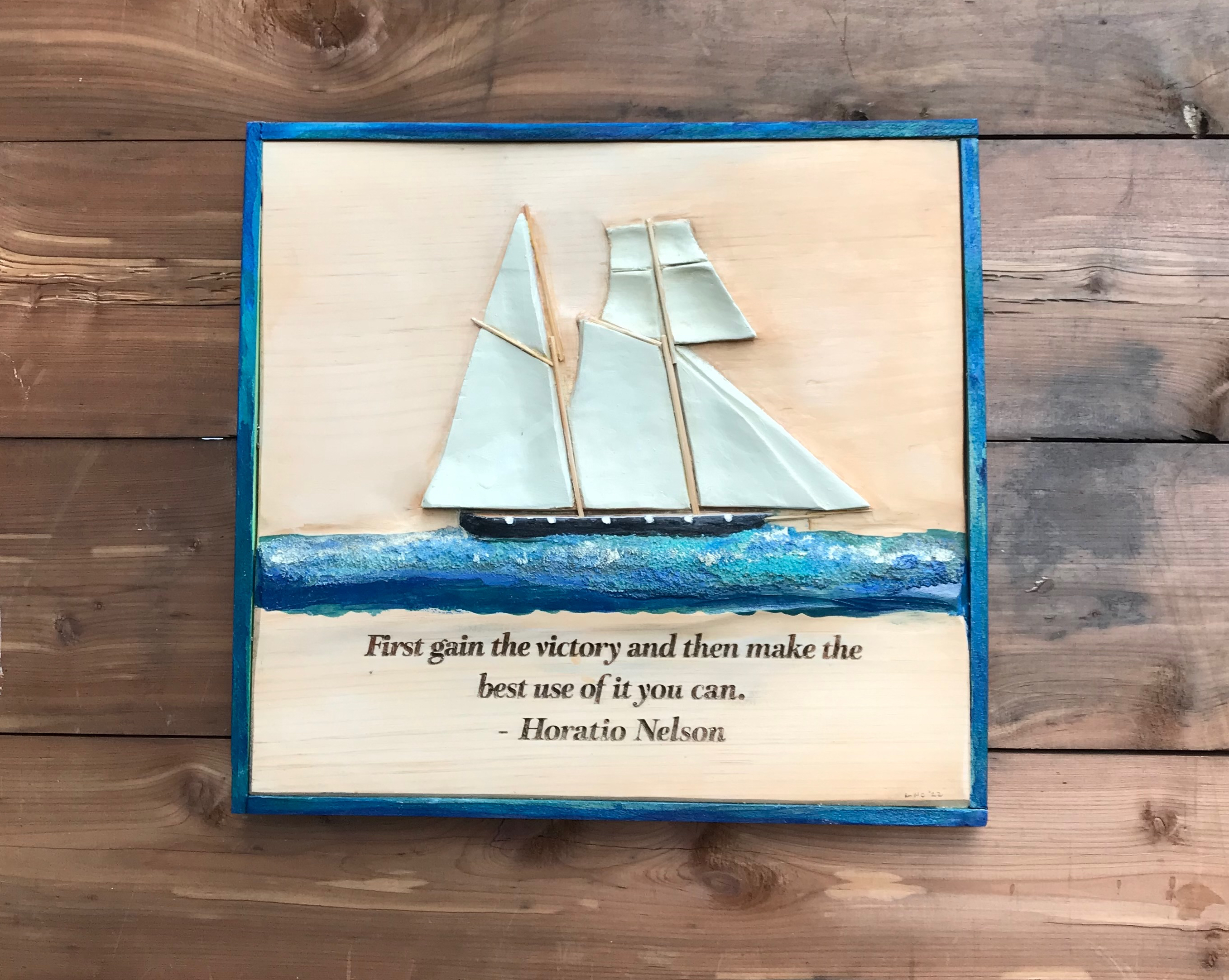 It’s tempting to pull a router out- roooom, roooom! But you have better control of how the background will look when you do it with gouges. After all, part of it is the sea around the hull, and you need the contour to add depth and perception to the foreground. Also, I’d like to play with some contour in the sky with cloudscapes. Up to now I’ve painted the sky in, but how about carving the sky in? We’ll see.