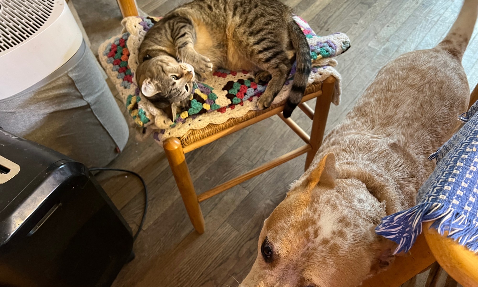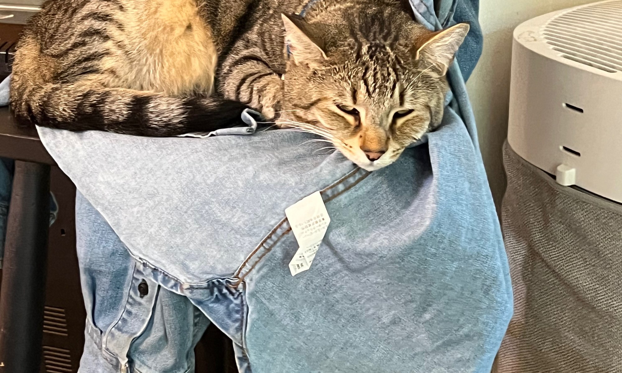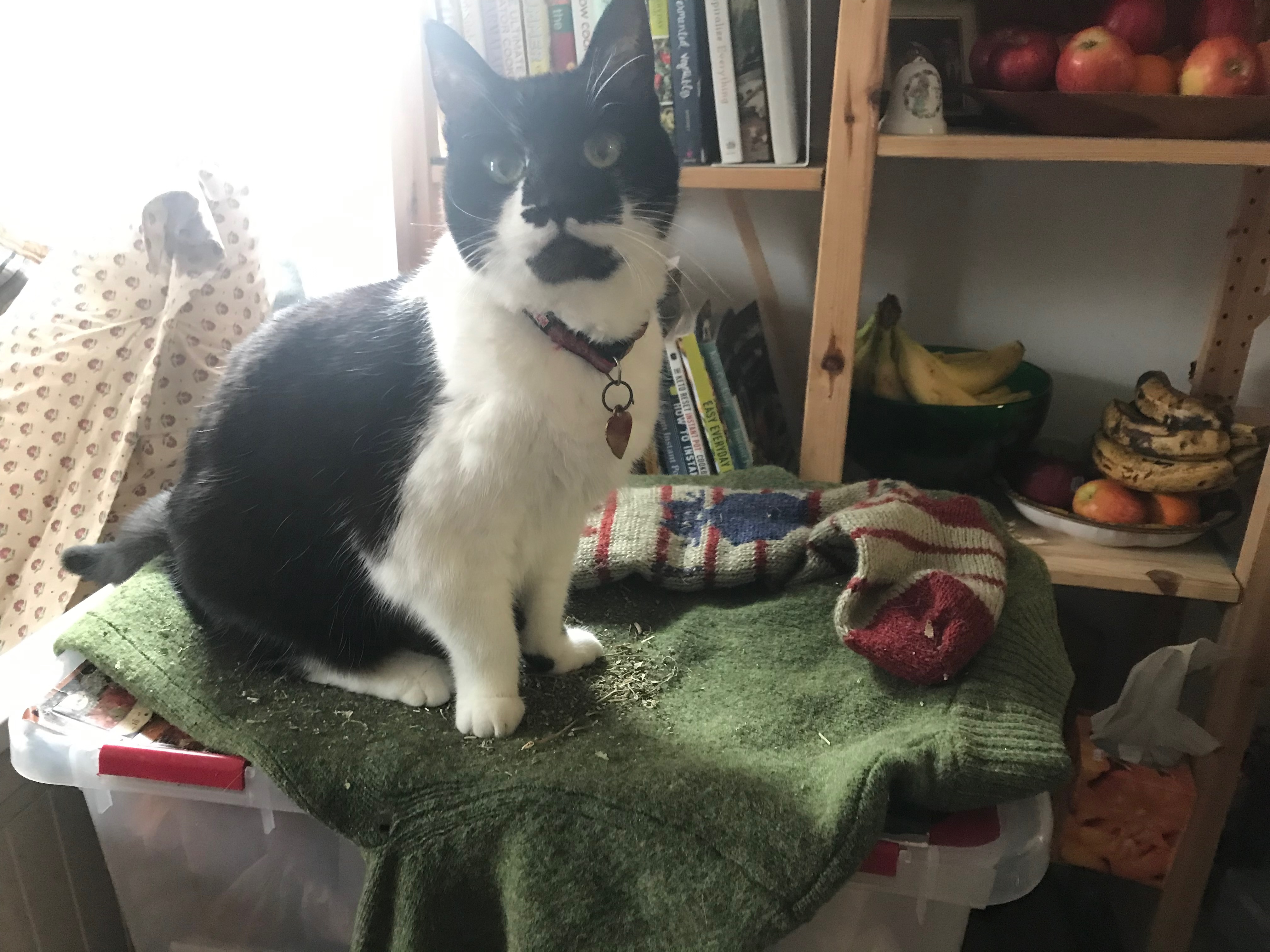 The black high chair is a leftover from when my kids were young. It was brought out of retirement for our grandson Arthur to use. Sabrina, our female kitty, has confiscated Arthur's playpen/ sleepy spot for her to play in. So Marcus has decided that the high chair is his. With a shirt or jacket …