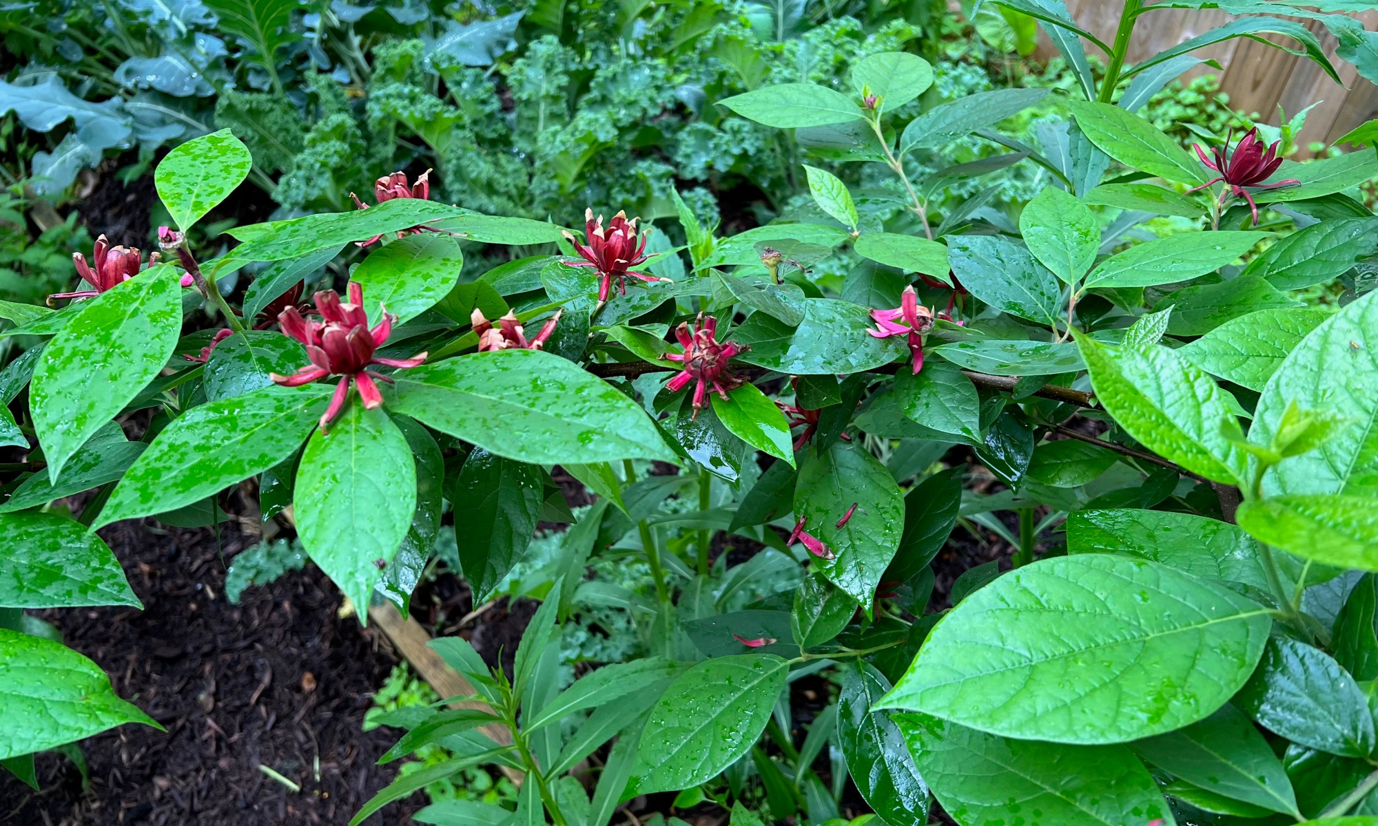 Carolina Allspice- this is the first year this shrub has blossomed. It was planted about nine years ago. It is native to the eastern United States but isn't native to New England. It was one of my horticultural experiments, and this year it paid off with some lovely blossoms.